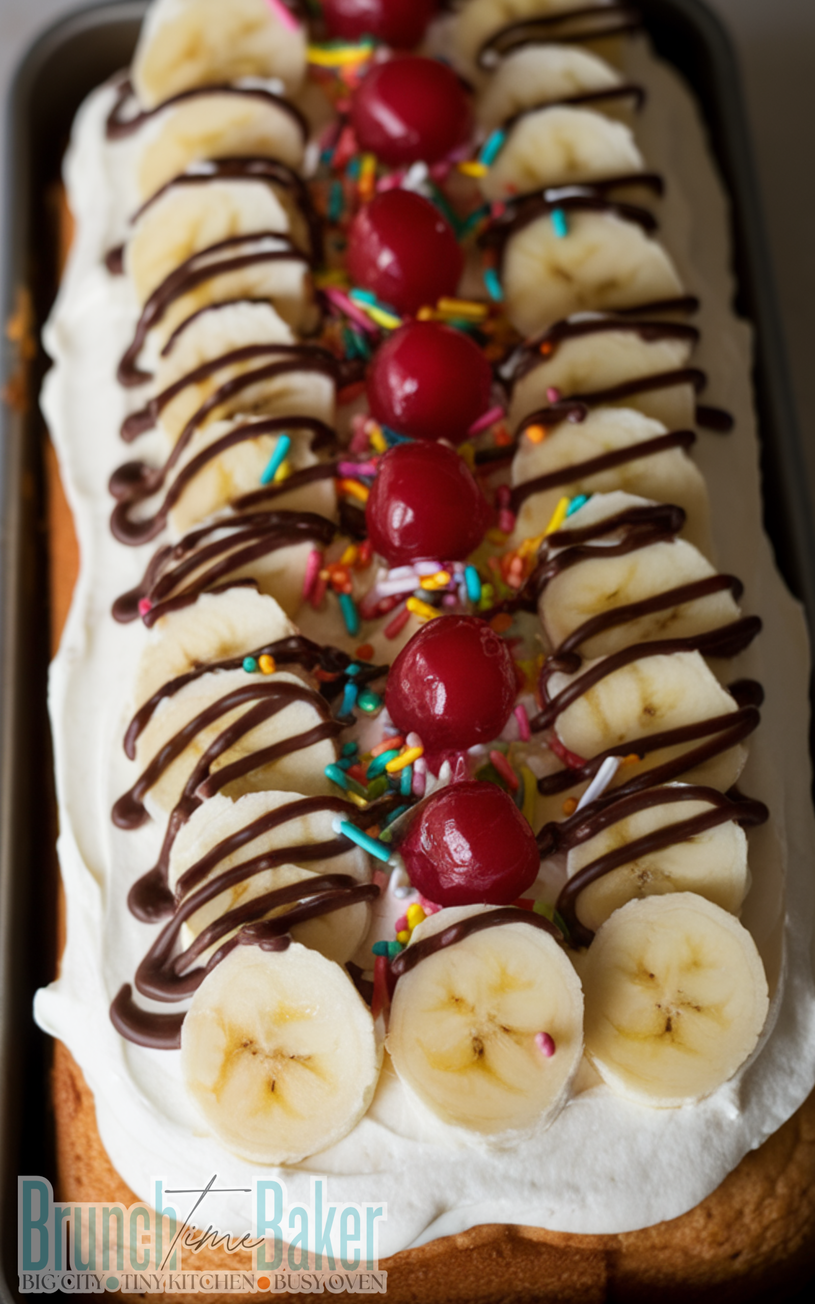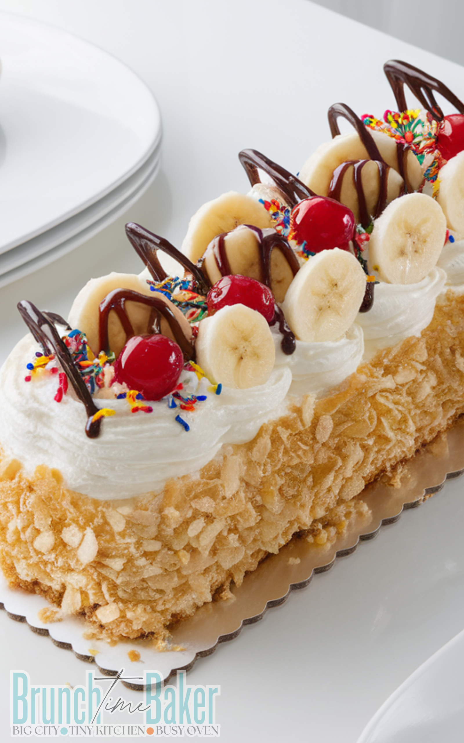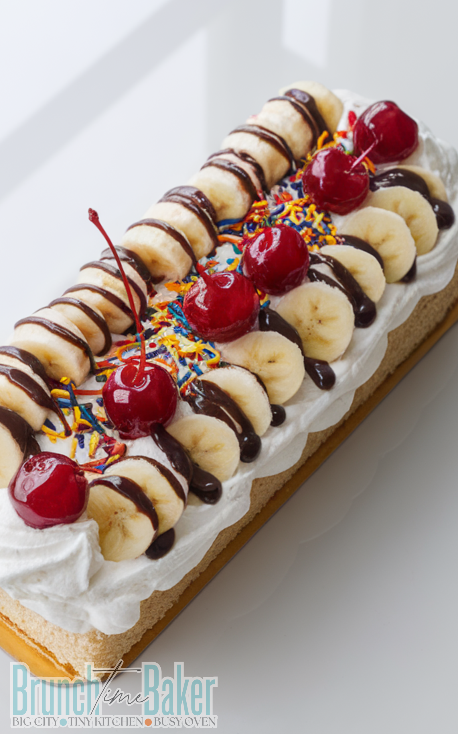 hourA fun and delicious cake inspired by the classic banana split with bananas, whipped cream, chocolate syrup, and cherries.
