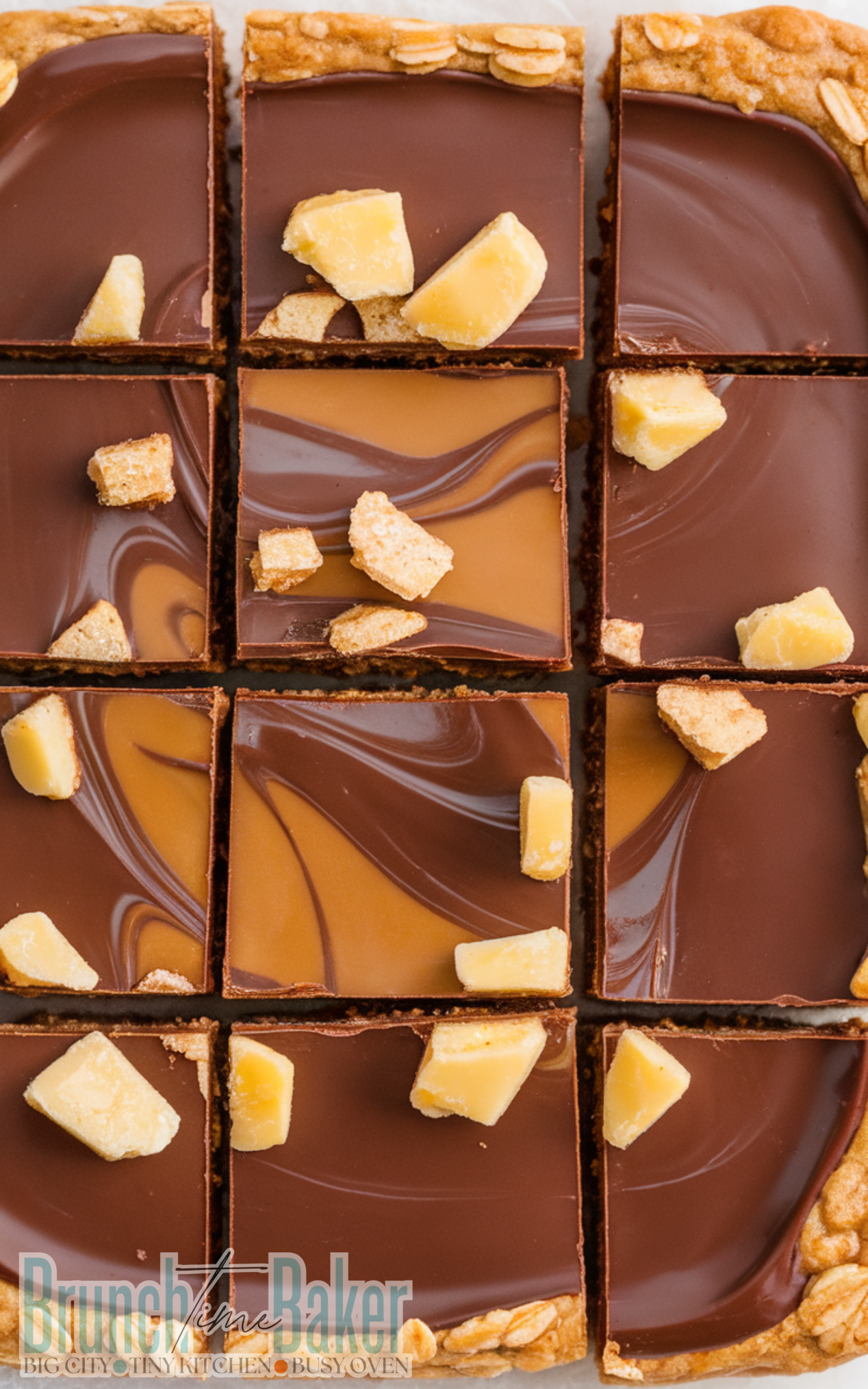 this recipe is made of a buttery oat base sweetened with brown sugar and sweetened condensed milk layered with chocolate chips and crunchy toffee bits.