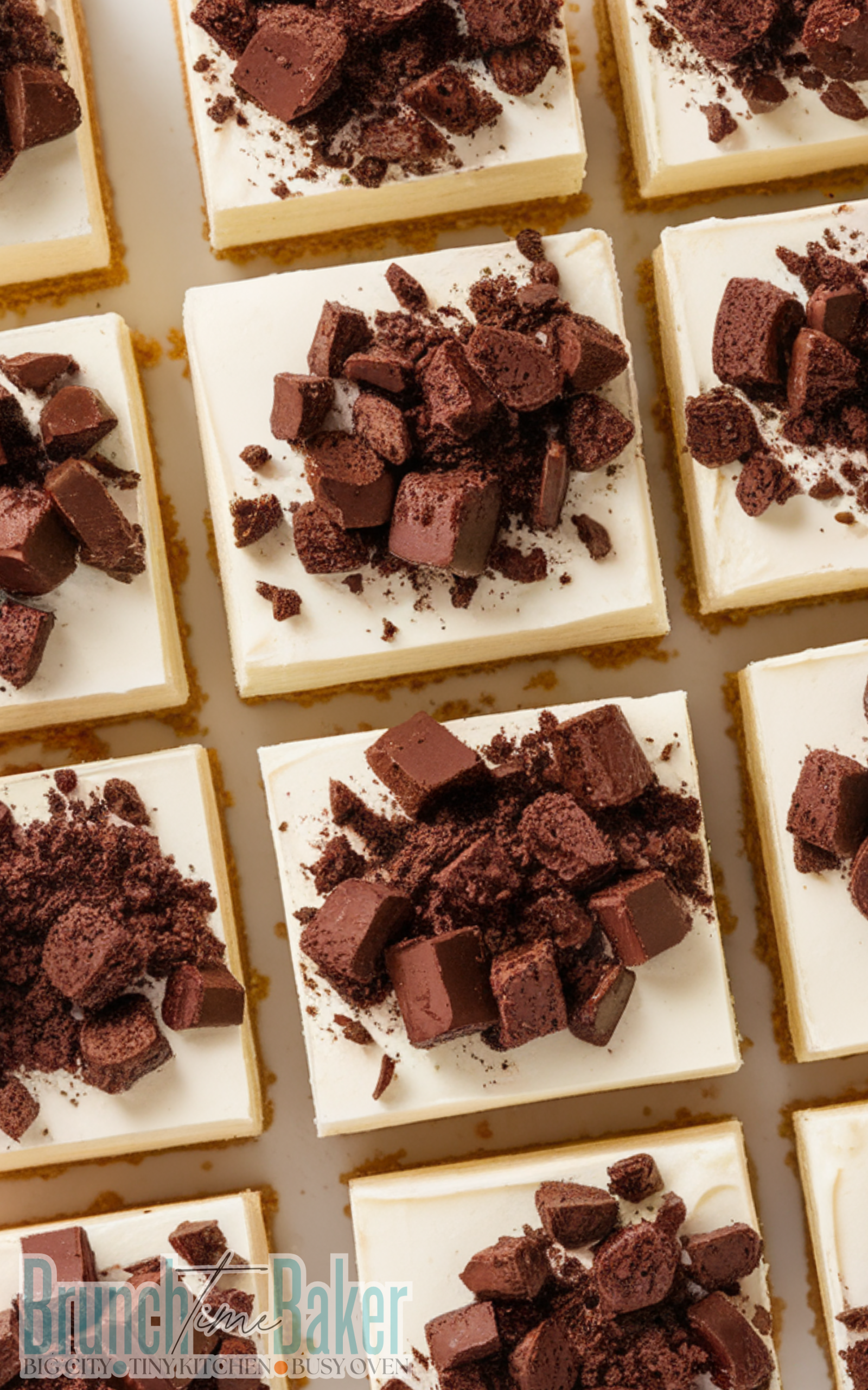 - preheat your oven to 350°f and line a 9×9 inch baking pan with parchment paper or lightly grease it then crush 1 1/2 cups of chocolate sandwich cookies until fine and mix them with 1/4 cup of melted butter press this mixture evenly into the bottom of the pan and bake for 8 minutes remove it from the oven and let it cool completely.