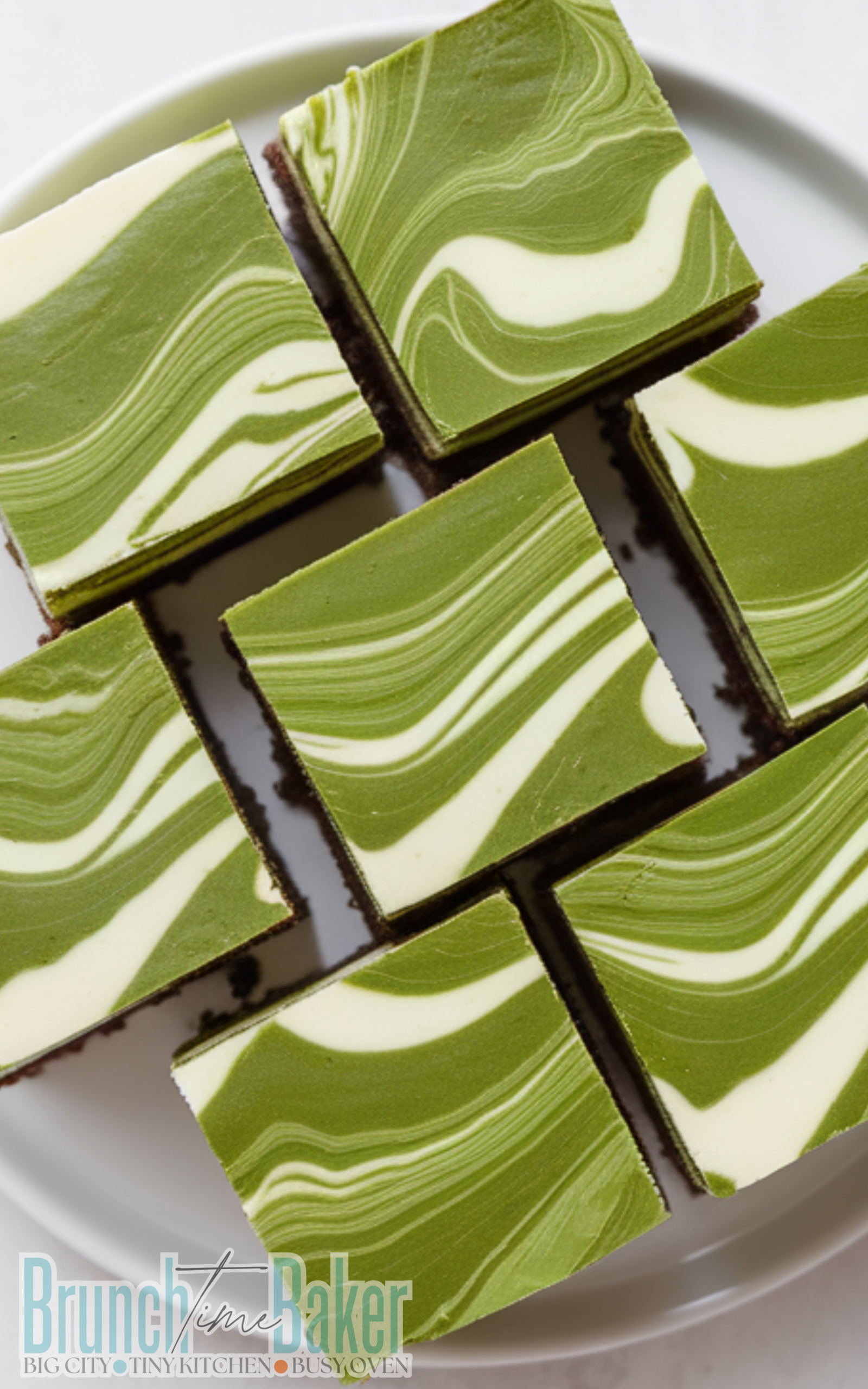 • Remove the brownies from the pan and cut into squares then serve and enjoy the creamy green swirls with a cup of tea or milk.