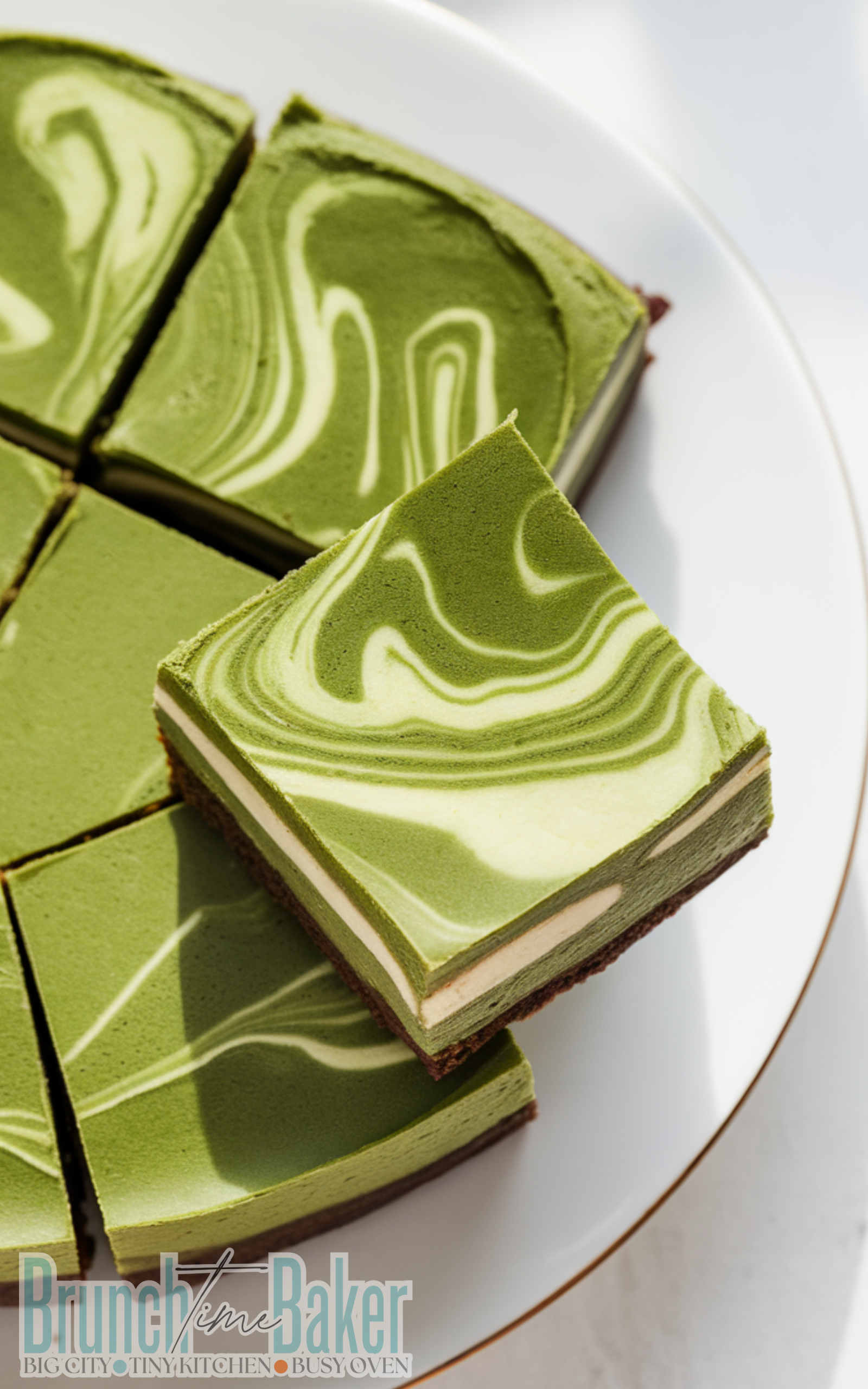 Creamy green tea brownies with a soft cheesecake swirl that are perfect for dessert or a snack.