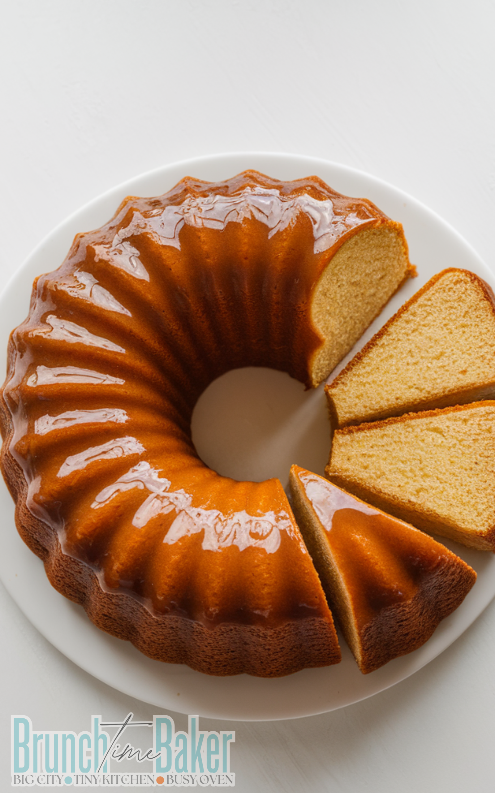 This rum cake is made of simple ingredients including flour, sugar, eggs, butter, milk, baking powder, salt, vanilla extract and dark rum for flavor along with a sweet glaze made from brown sugar, water, butter and extra rum.